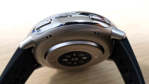 ケースは樹脂製です。背面にスピーカー、マイク、バイオセンサーが搭載されています。