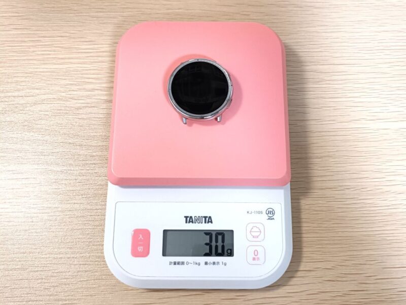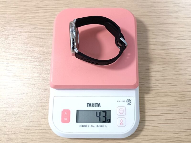 重さは本体だけで約30g、バンド込みでも約43gと非常に軽量です。